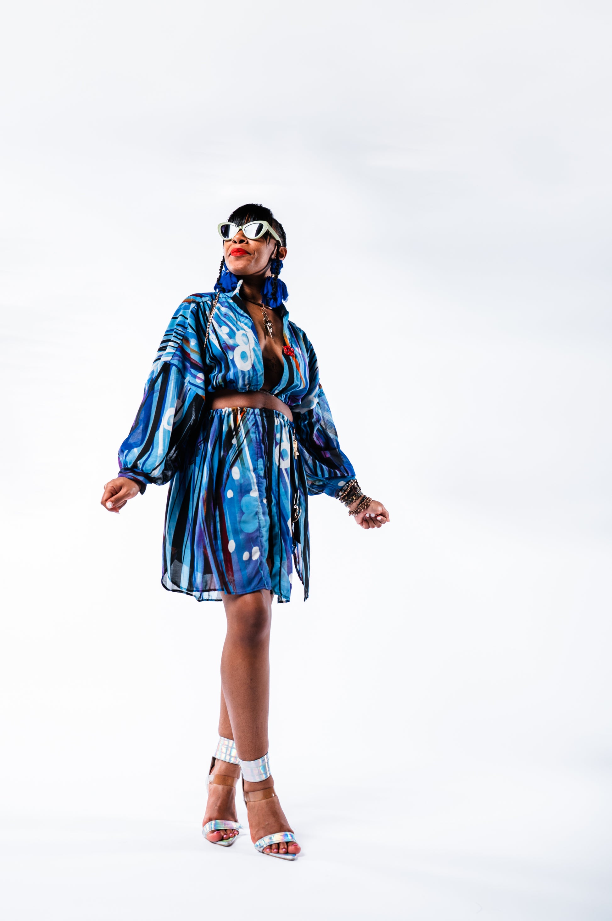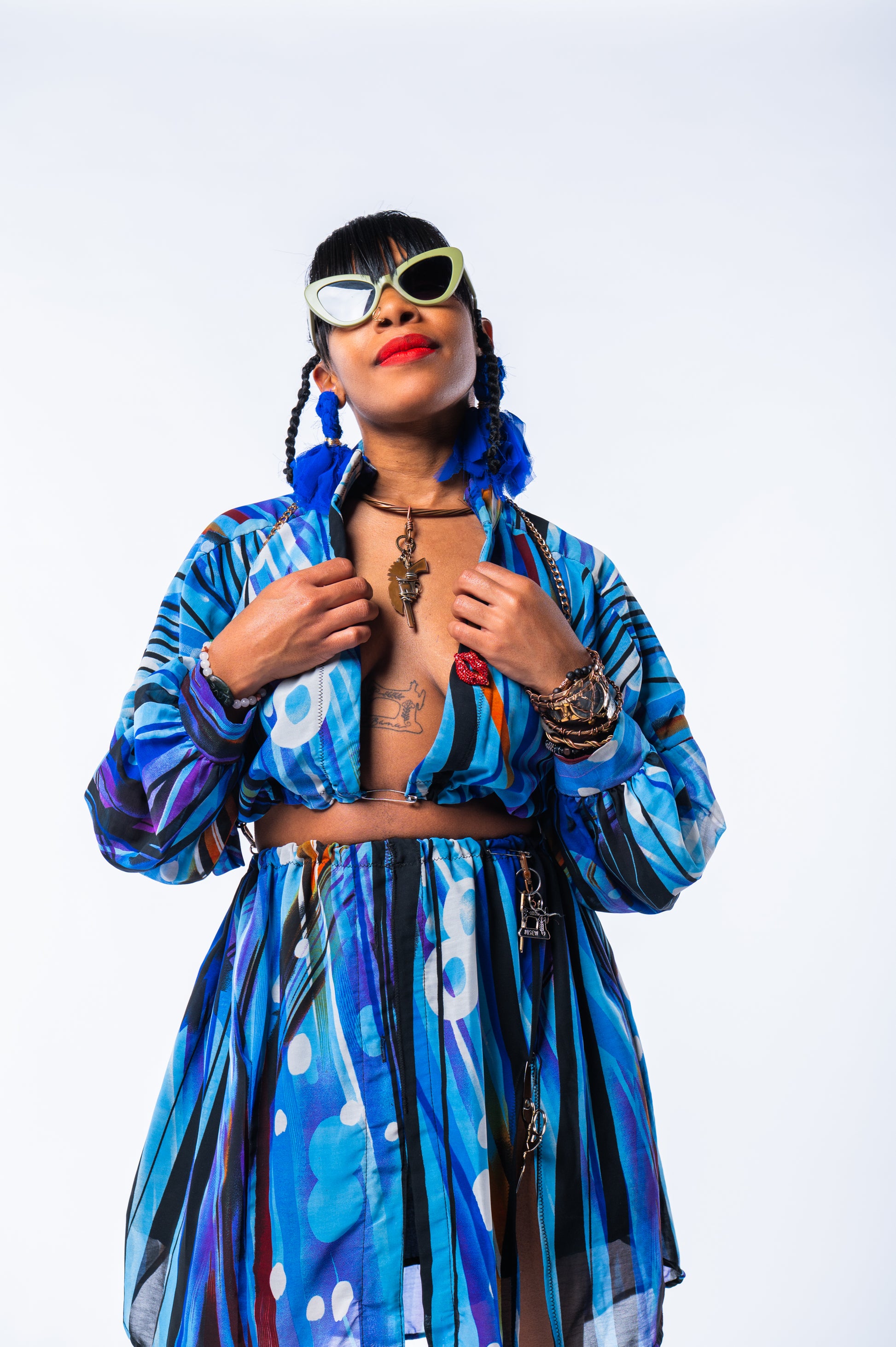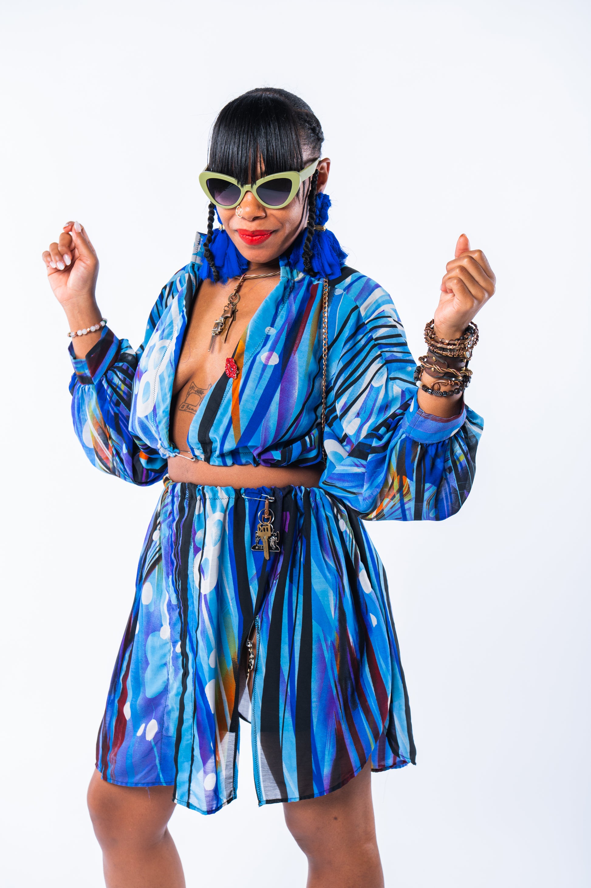Sky She Blue is a thoughtfully repurposed two-piece top, crafted from a 2XL thrifted blouse and tailored by hand. Designed to flatter sizes small through extra-large, this unique ensemble blends sustainable fashion with refined style, offering a versatile and elegant addition to your wardrobe. Each piece carries a story, transformed into wearable art that complements your individuality.
