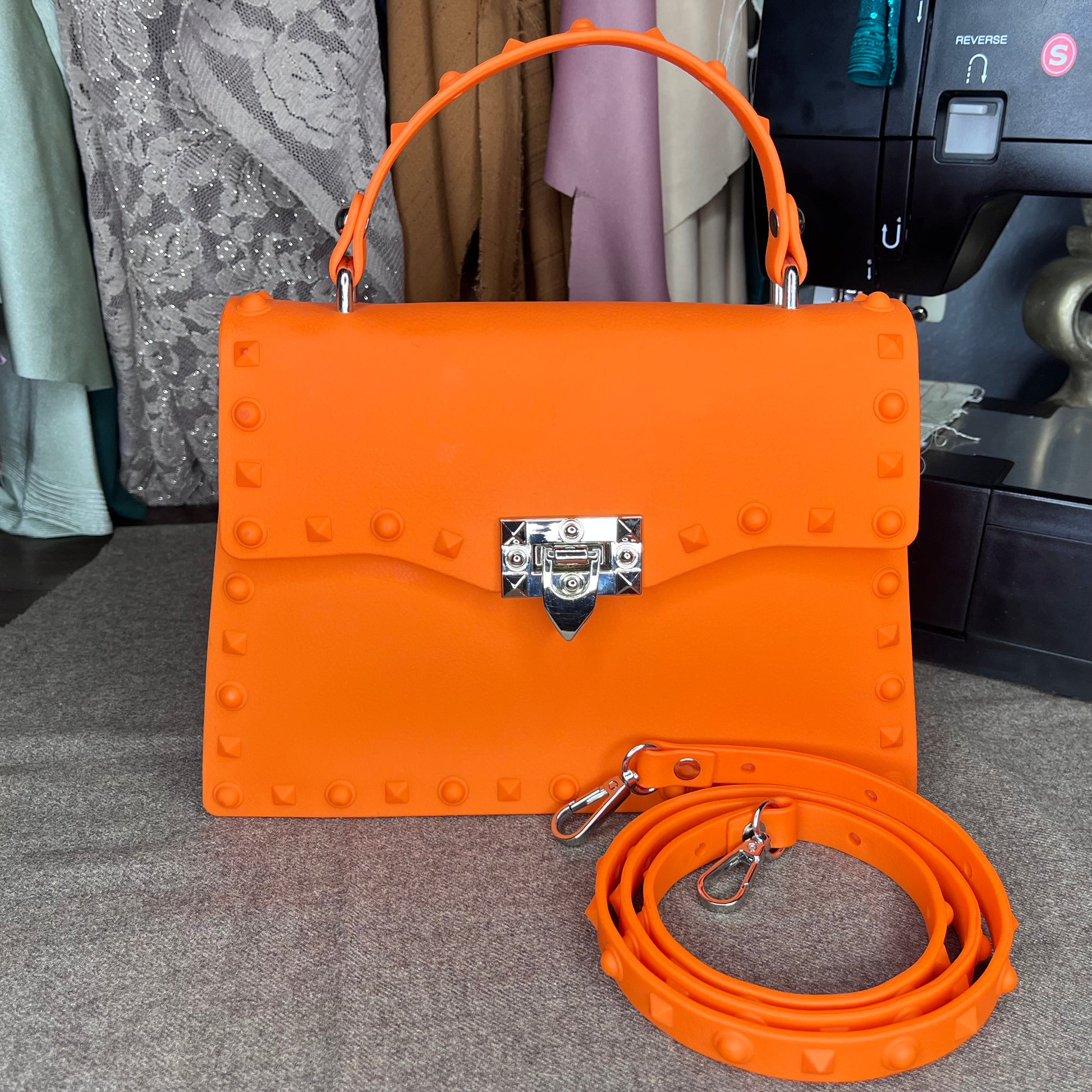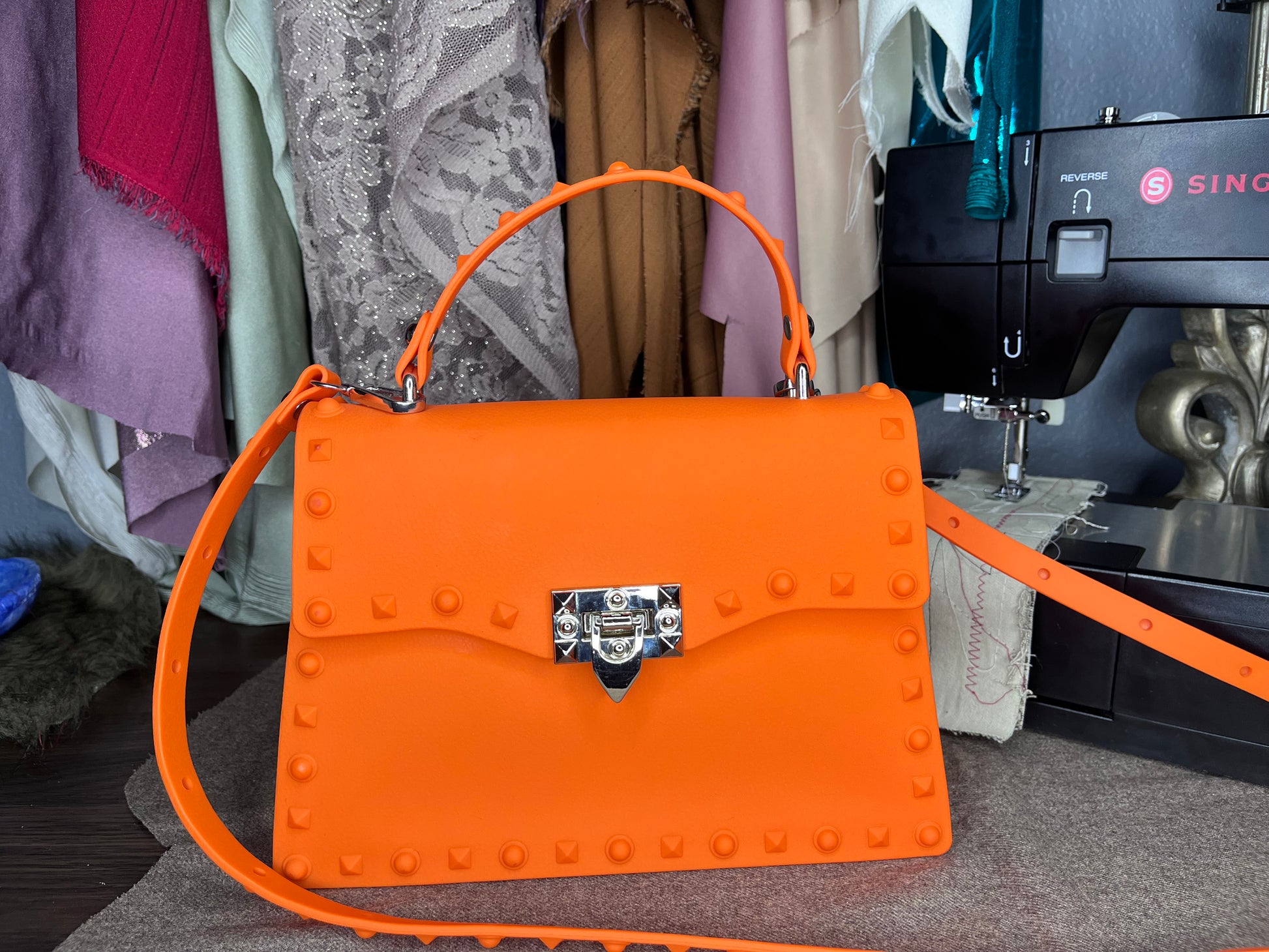 Elevate your ensemble with the SUNshine purse, a striking orange accessory crafted from durable plastic. Its sleek design is complemented by silver hardware and a matching strap, blending vivid color with polished sophistication for a modern, elegant look.